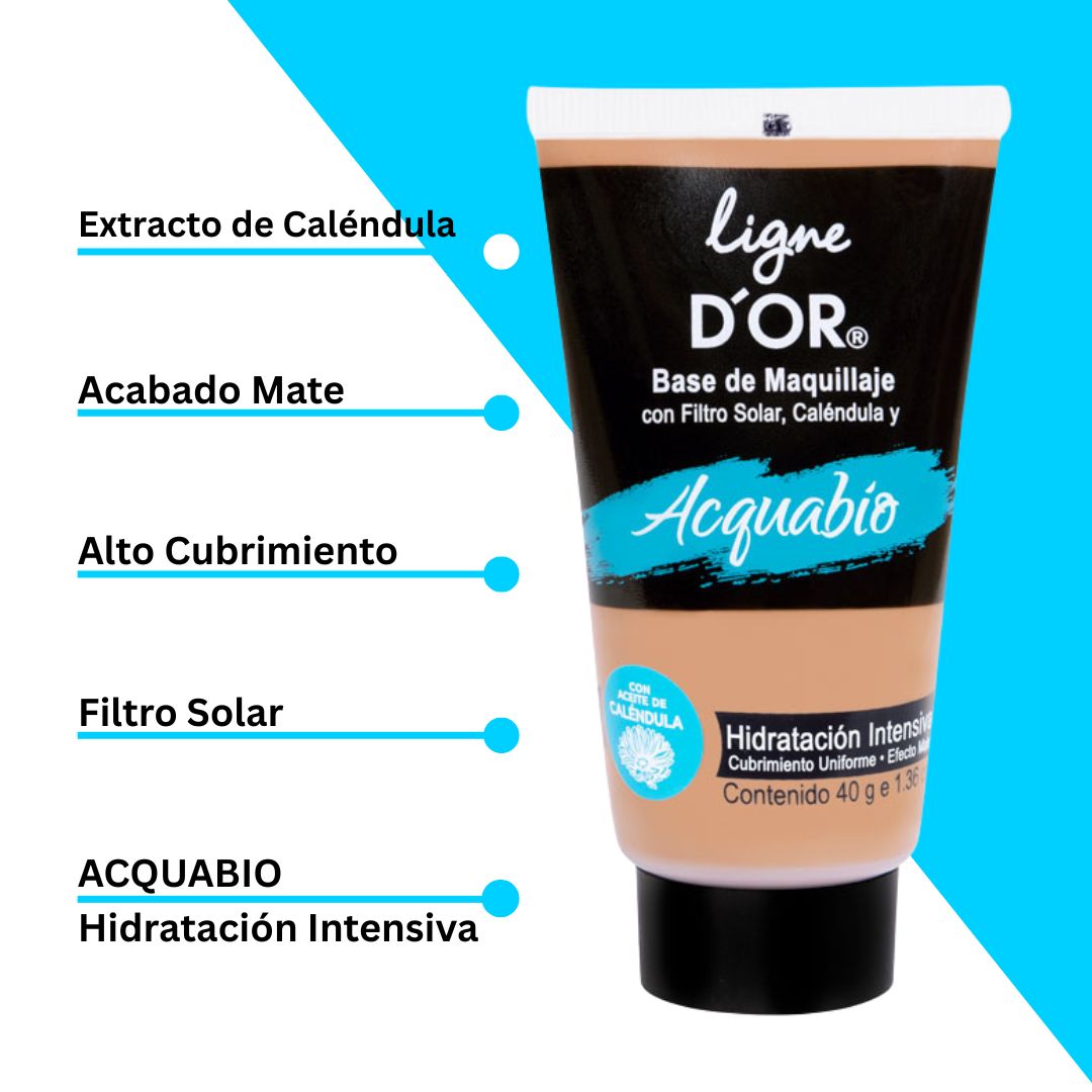 Base de maquillaje cremosa con tecnología Acquabio, que ofrece hidratación intensa y protección solar. Proporciona un acabado mate con cobertura media y uniforme, revitalizando la piel.
